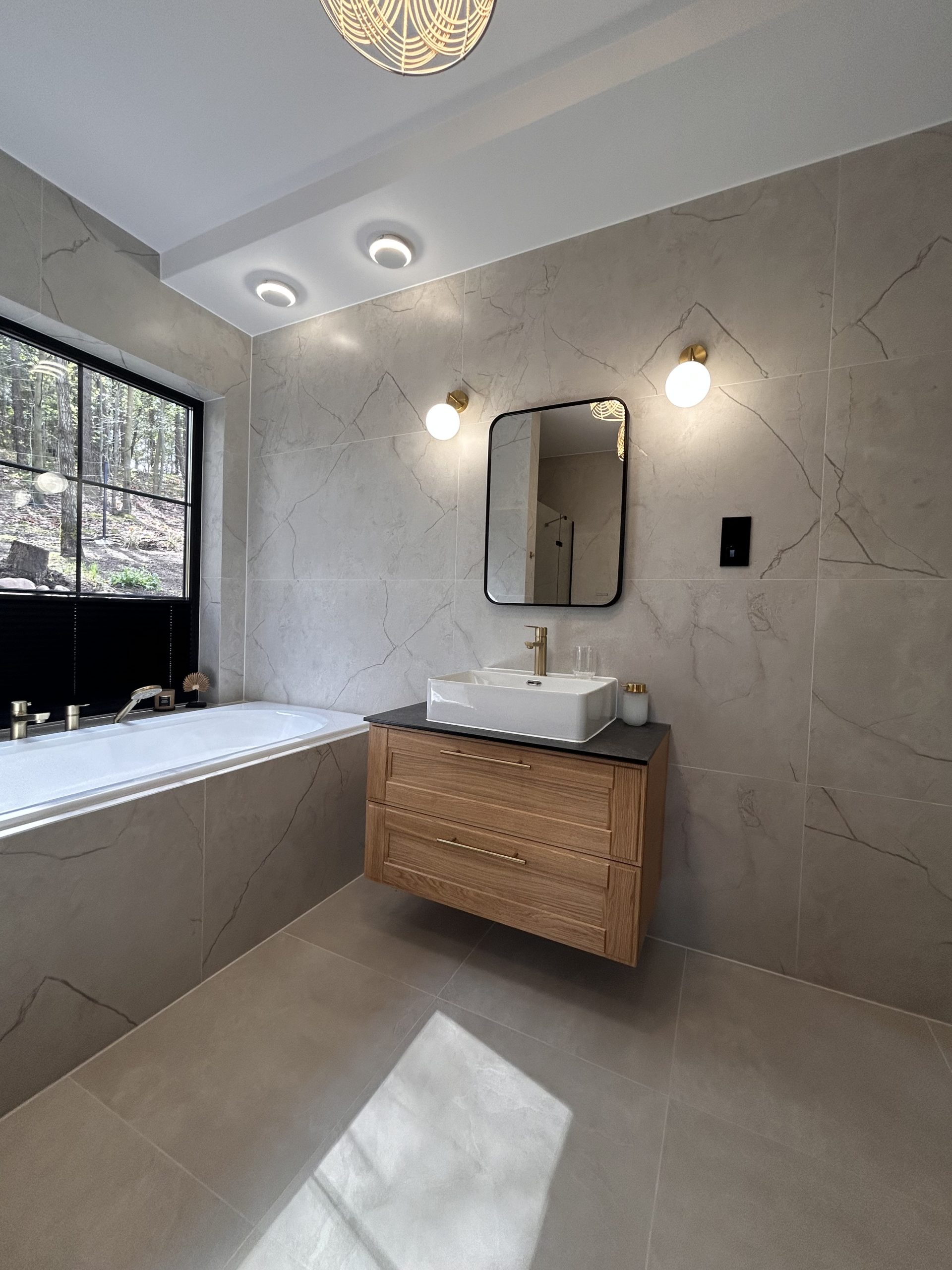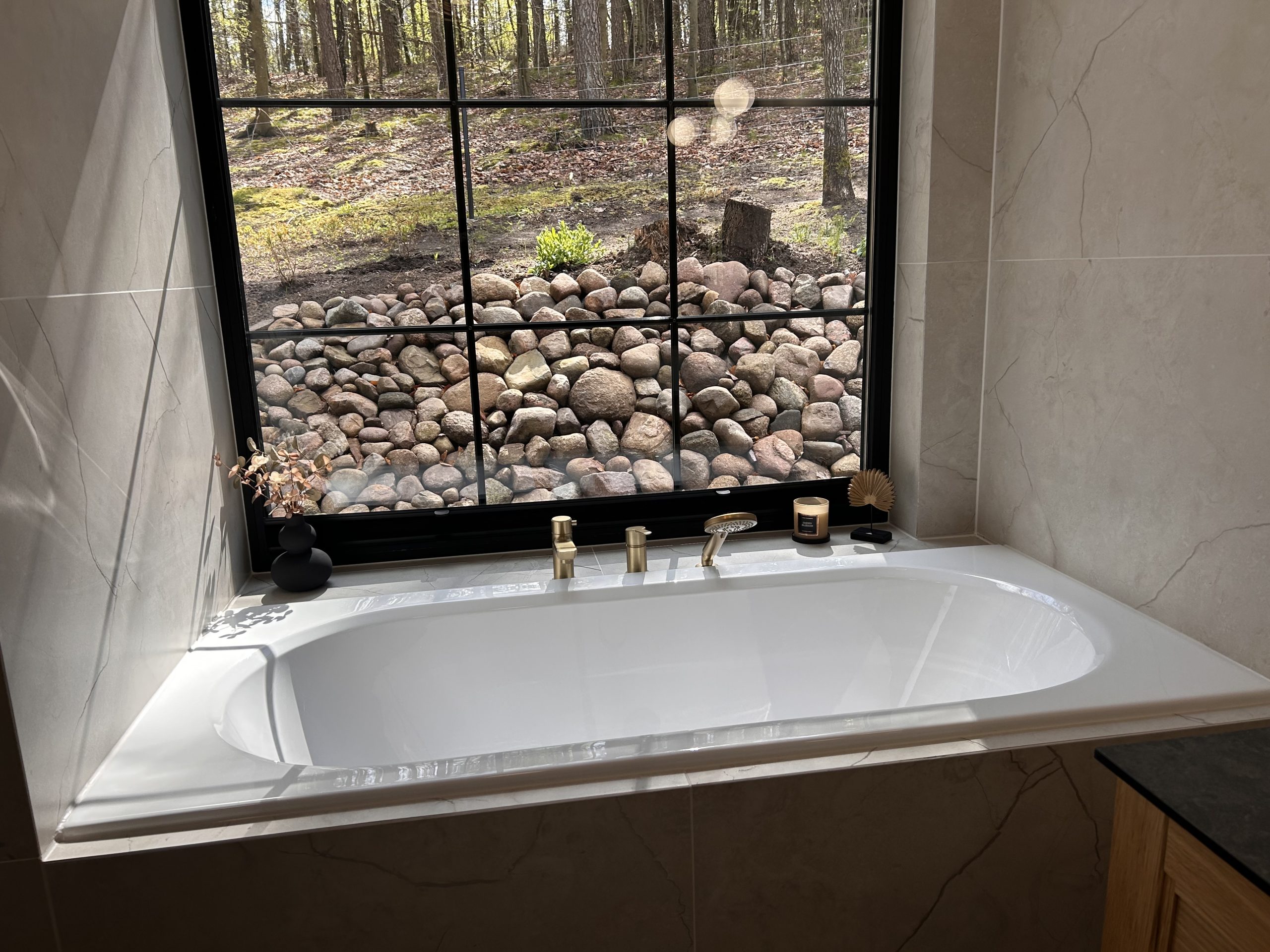 - bathroom with toilet and shower, and bathtub with forest view and underfloor heating